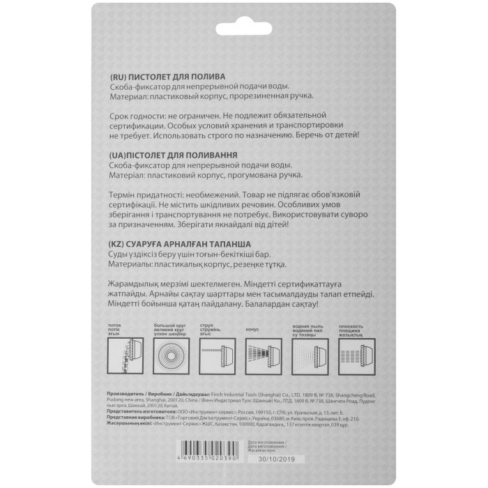 6 режимов распыления. Скоба-фиксатор для непрерывной подачи воды. Универсальное быстросъемное соединение. Материал: пластиковый корпус, обрезиненная ручка. Упаковка: блистер.