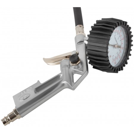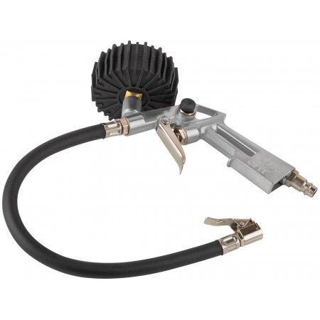 Пистолет с манометром, до 6 атм, 0,1 атм.Материал: алюминий.Cоединение быстросъемное. Измерительная шкала до 6 атмосфер, с шагом 0,1 атмосферы, диаметр выходного отверстия (ниппель) 1/4”, поперечное расположение манометра. Используется для контроля давления при подаче воздуха.