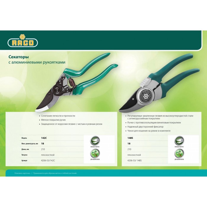 Секаторы RACO созданы для садоводов-любителей. Высококачественные материалы обеспечивают чистый рез и являются гарантией длительного срока службы изделия. А алюминиевые ручки делают инструмент легким.