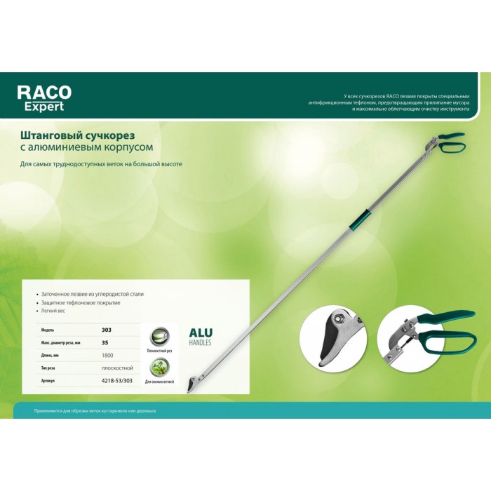 Сучкорезы RACO изготовлены из современных и качественных материалов. Благодаря специальному антифрикционному тефлоновому покрытию лезвий и алюминиевым рукояткам инструменты удобны в работе, идеально срезают ветки и обладают длительным сроком службы.
