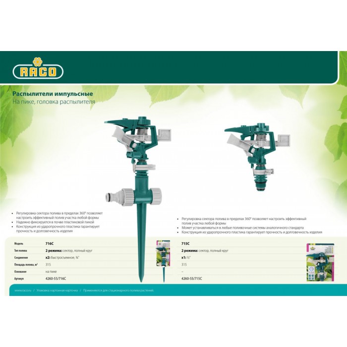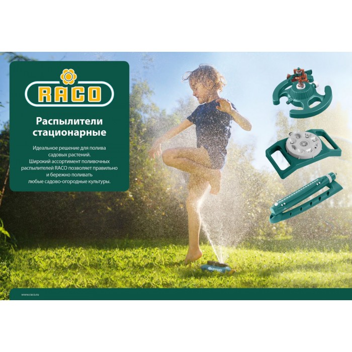 Стационарные распылители RACO обладают высоким уровнем качества, изготовлены из качественных материалов. Надёжны в работе, служат долго, исключительно удобны в использовании. Обеспечивают простое и качественное подключение к поливочной системе. Широкий ассортимент моделей для всех видов полива.