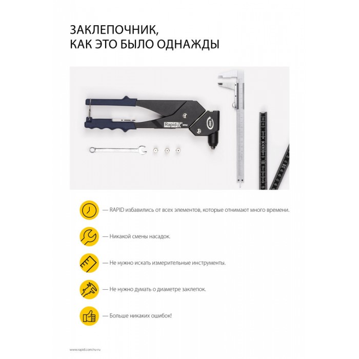Наслаждайтесь эффективной работой с заклепками при помощи единственного инструмента. Благодаря уникальной многофункциональной насадке, механический заклепочник RP60 Multi может работать без смены насадок. Кроме того, он оснащен вращающейся на 360° головкой, что облегчает работу в ограниченных пространствах. Это означает меньшее количество простоев и оптимальные результаты при работе с любым видом листового металла. RP60 Multi также оснащен интеллектуальной измерительной системой, которая измеряет размеры заклепок и толщину материала. Теперь вы можете быть уверены, что используете подходящую заклепку в соответствующем ей отверстии. Среди других отличительных черт инструмента мягкая рукоятка для максимального комфорта, закаленные металлические детали для долгого срока службы и стильная черная матовая отделка.