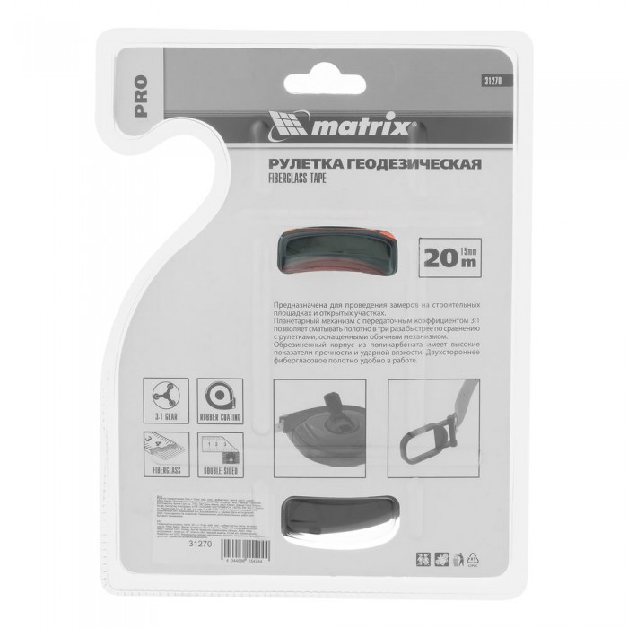 Рулетка геодезическая 20 м х 15 мм, закрытый корпус, фибергласовая лента, двусторонняя шкала, Pro Matrix
