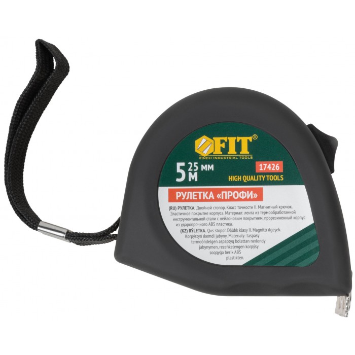 «Профи». Калиброванная лента класс II, двойной стопор, магнитный крючок. Материал: стальная лента с нейлоновым покрытием, эластичный двухцветный ABS пластиковый противоударный корпус. Упаковка: пластиковый подвес.