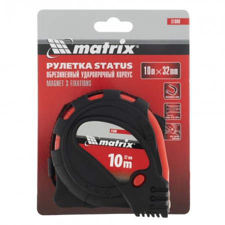 Рулетка Status Magnet 3 fixations,10 м х 32 мм,обрезиненный корпус,зацеп с магнитом Matrix