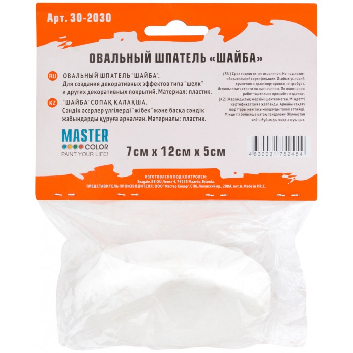 Овальный шпатель «шайба». Специальный инстру-мент для нанесения жидких декоративных красок и покрытий. Благодаря особой форме рабочей поверхности, позволяет формировать рисунки с различными эффектами. Материал: пластик.