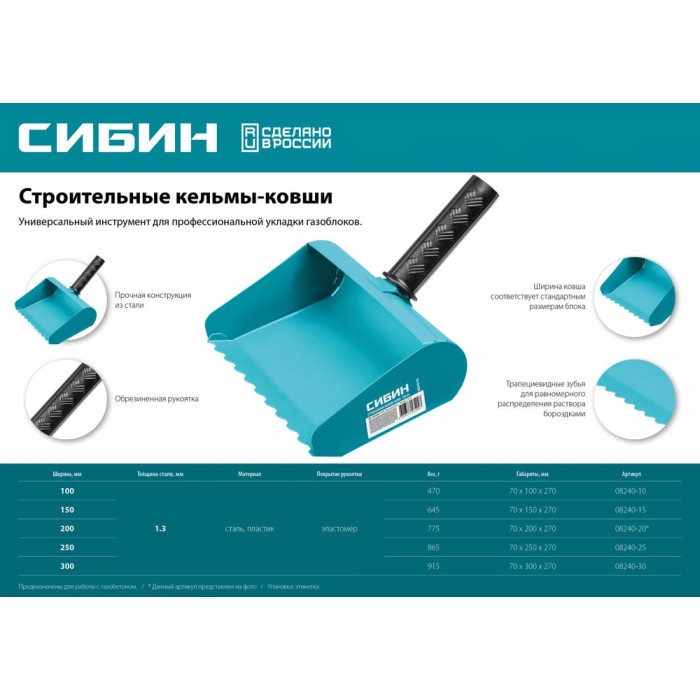 Универсальная металлическая КЕЛЬМА-КОВШ для профессиональной укладки газоблоков, обрезиненая рукоятка, из стали 1,3 мм. Прочная сварная конструкция. Специальные зубья для создания ровных трапециевидных бороздок из раствора.