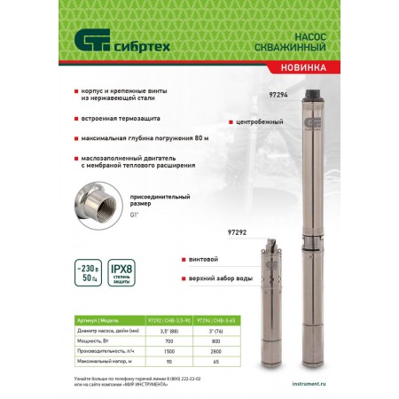 Скважинный насос CНЦ-3-65, центробежный, диаметр 3", 800 Вт, 2800 л/ч, напор 65 м Сибртех (97294)