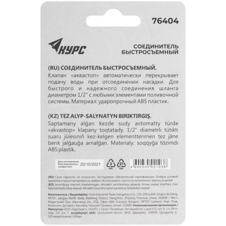 Универсальный быстросъемный. С клапаном ''аква стоп'' Для быстрого и надежного соединения шланга с любыми элементами и насадками поливочной системы. Клапан ''аквастоп'' автоматически прекращает подачу воды, при отсоединении насадки. Материал: ABS пластик. Упаковка: блистер.
