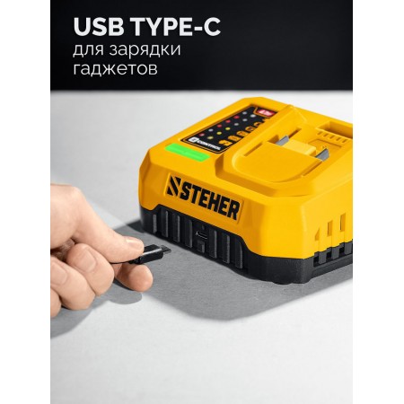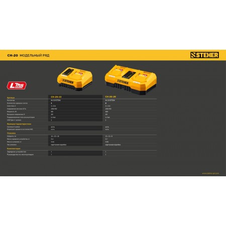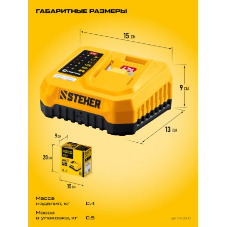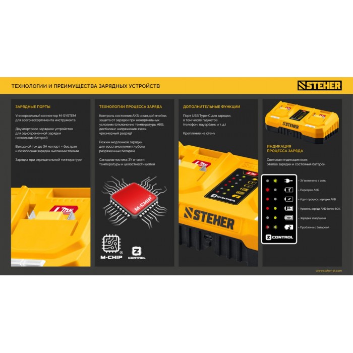 Полностью цифровое интеллектуальное устройство для бережной и максимальной (в отличие от устройств другого типа) зарядки батареи - для полной отдачи Вашего инструмента STEHER