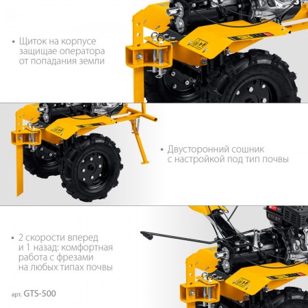 - 2 скорости вперед (понижающая, основная) и 1 назад позволяют комфортно работать на любых типах почвы