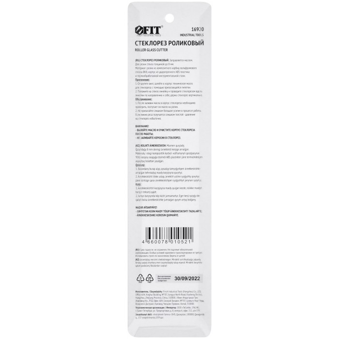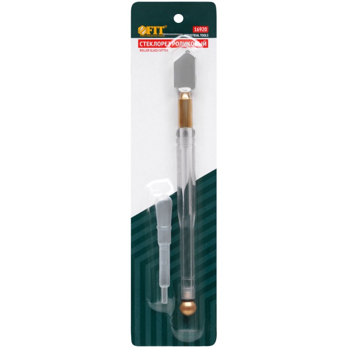 Для резки стекла толщиной до 8 мм. Заправляется маслом. Материал: инструментальная сталь, ABS пластик, твердосплавный ролик. Упаковка: блистер