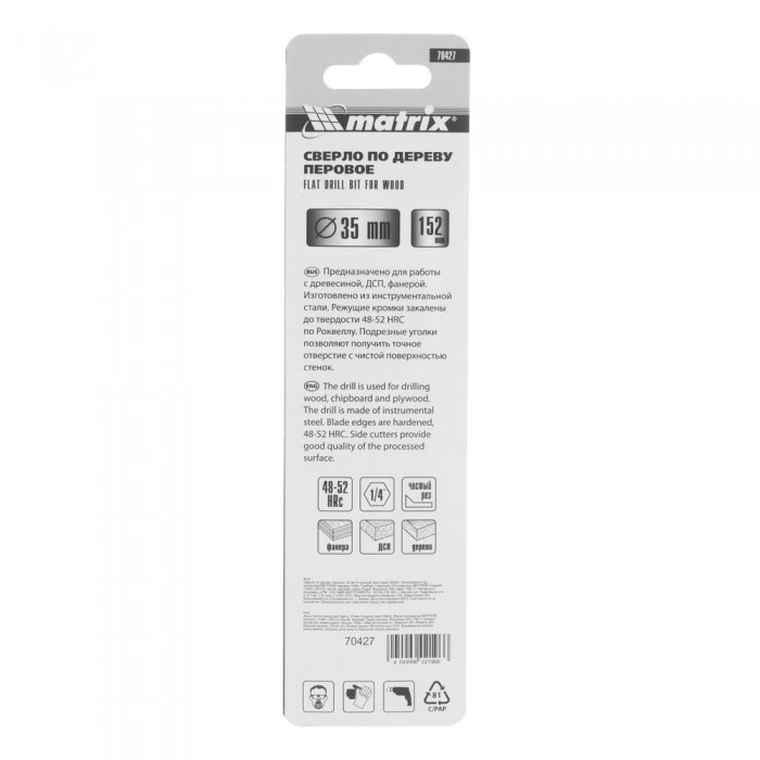 Сверло по дереву перовое, 35 мм, шестигранный хвостовик Matrix