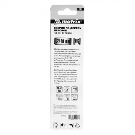 Сверло по дереву перовое, 40 мм, шестигранный хвостовик Matrix