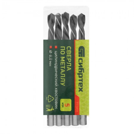 Сверло по металлу, 8 мм, быстрорежущая сталь, 5 шт, цилиндрический хвостовик Сибртех