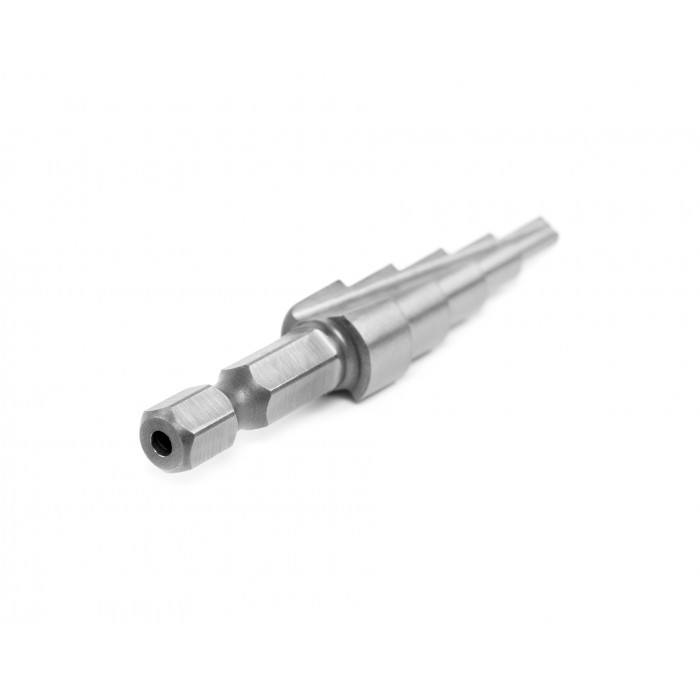 Сверло ступенчатое от бренда HORTZ, предназначено для сверления и рассверливания отверстий в листовых материалах (сталь, цветные металлы, пластик). Одно сверло заменяет целый набор традиционных спиральных сверл, позволяет получать большие отверстия в листовых материалах. Отлично рассверливает существующие отверстия. Хвостовик сверла — цилиндрический с 6 гранями.