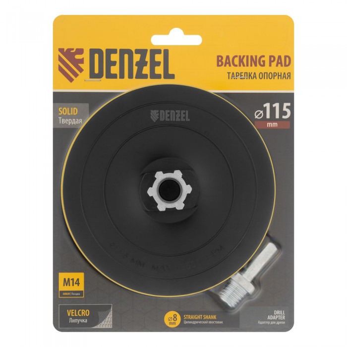Тарелка опорная для дрели и УШМ с липучкой, 115 мм, твердая, с адаптером c М14 на d8 Denzel (76253)