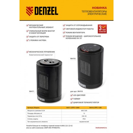 Тепловентилятор электрический керамический DTFC-1200, 3 режима, вентилятор, нагрев 600/1200 Вт Denzel (96418)