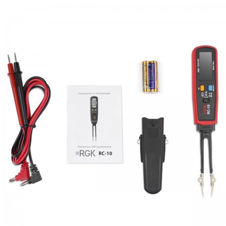 Измеритель smd компонентов RGK RC-10, Тестовые провода - 1 комплект, Запасные наконечники - 2шт, Батарея 1.5 В (AAA) - 2шт, Руководство по эксплуатации