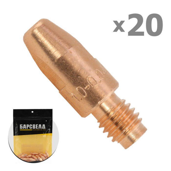 Контактный токосъемный наконечник БАРСВЕЛД E-Cu с резьбой М8, под проволоку диаметром 1,0 мм - расходная деталь полуавтоматических MIG/MAG горелок. Изготовливаются из меди, тем самым обеспечивается их надежность, высокая электропроводность, теплопроводность и самое низкое удельное сопротивление.