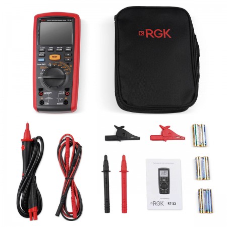 Мегаомметр RGK RT-32 , Комплект измерительных проводов, Чехол, Зажимы типа "крокодил" - 2 шт. , Измерительный наконечник - 2 шт., Щуп для дистанционных измерений, Батарея питания АА - 6 шт. , Руководство по эксплуатации