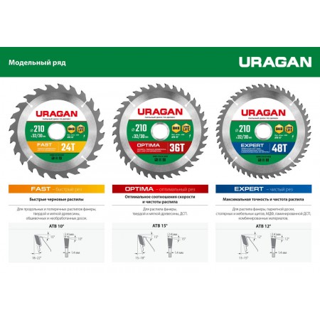 Особая форма твердосплавного зуба с переменным углом наклона верхней плоскости специально разработана для эффективного и производительного пиления фанеры, твердой и мягкой древесины, обшивочных и необработанных доскок.