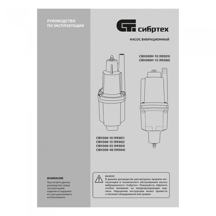 Вибрационный насос СВН300Н-15, нижний забор, 300 Вт, напор 75 м, 1200 л/ч, кабель 15 м Сибртех (99306)