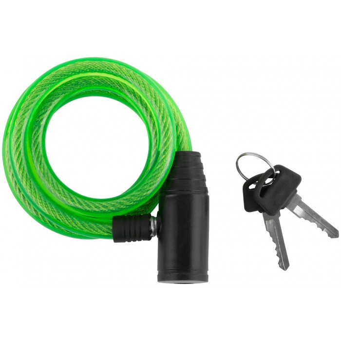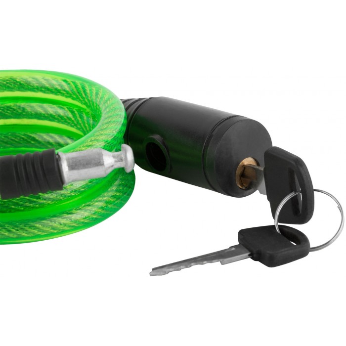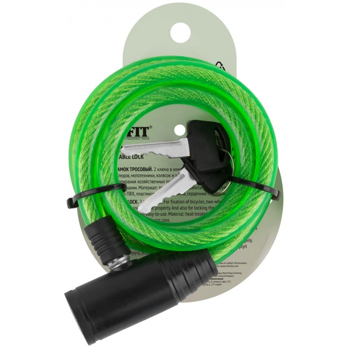 Материал: трос из инструментальной стали, оплетка из ПВХ, пластиковый корпус, сердечник из цинкового сплава. 2 ключа в комплекте. Упаковка: п/э конверт с картонным подвесом.