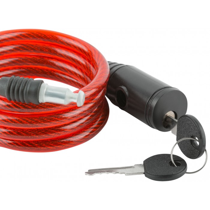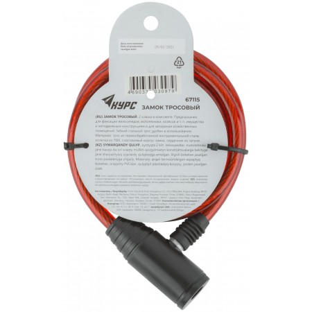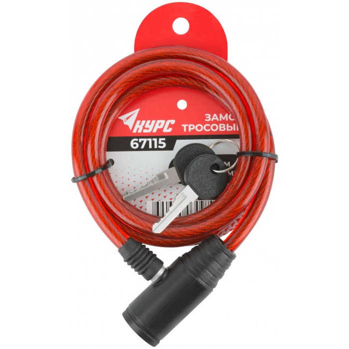 Материал: трос из инструментальной стали, оплетка из ПВХ, пластиковый корпус замка, сердечник из латуни. 2 ключа в комплекте. Упаковка: картонный подвес.