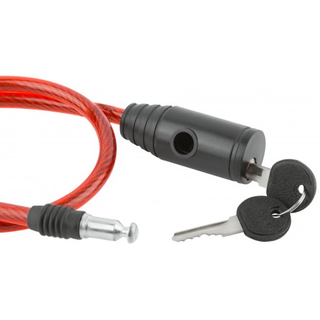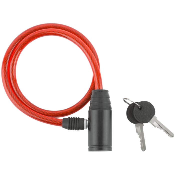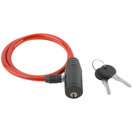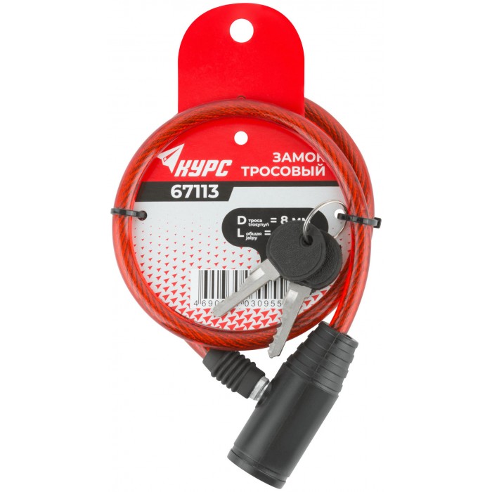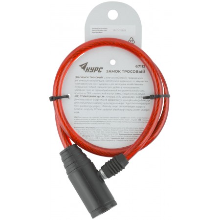Материал: трос из инструментальной стали, оплетка из ПВХ, пластиковый корпус замка, сердечник из латуни. 2 ключа в комплекте. Упаковка: картонный подвес.