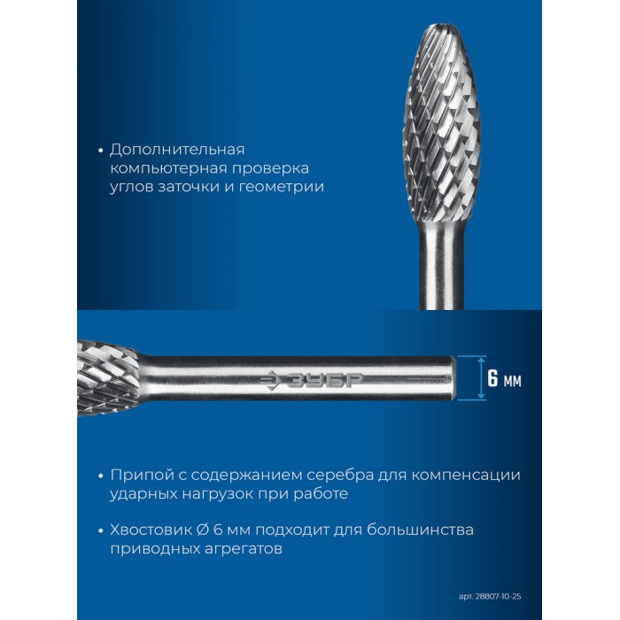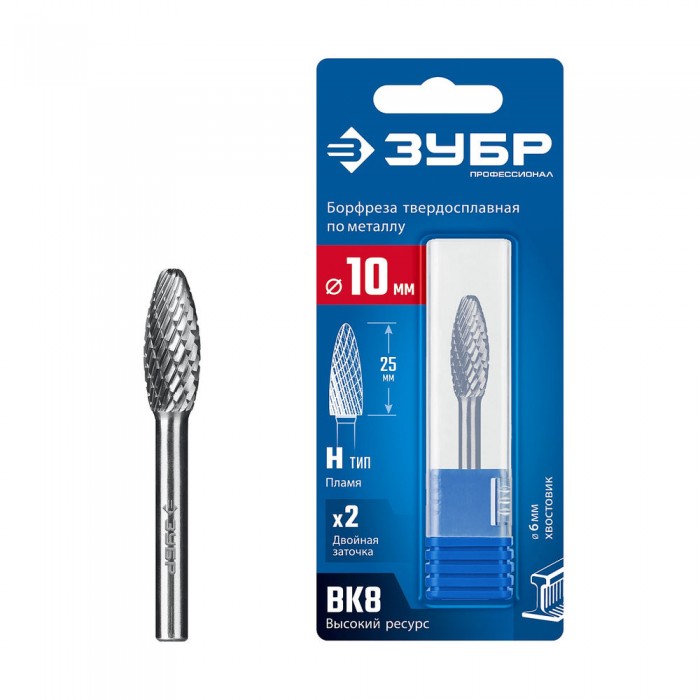 Борфреза твердосплавная 10?25 мм тип H пламя радиус 2.0 мм хв-к 6 мм Профессионал ЗУБР 28807-10-25