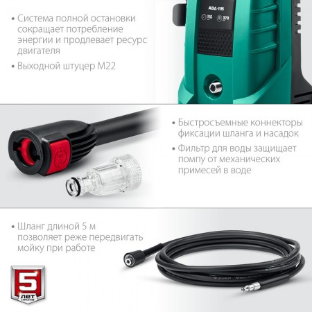 Мощное изделие для удаления любых загрязнений при помощи струи воды высокого давления. Благодаря системе полной остановки, помпа не работает при ненажатом пистолете – это экономит воду и ресурс изделия при неизбежных паузах в работе. Элегантный дизайн и удобная конструкция с держателями для аксессуаров делают работу с изделием комфортной. Регулировка выходной струи позволяет обрабатывать различные поверхности - автомобили, стены, велосипеды, напольные покрытия и т.п.