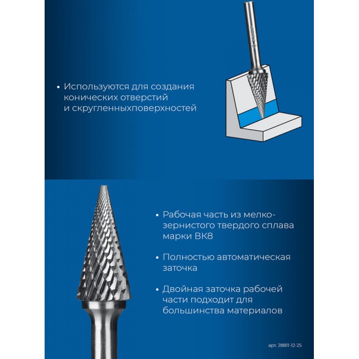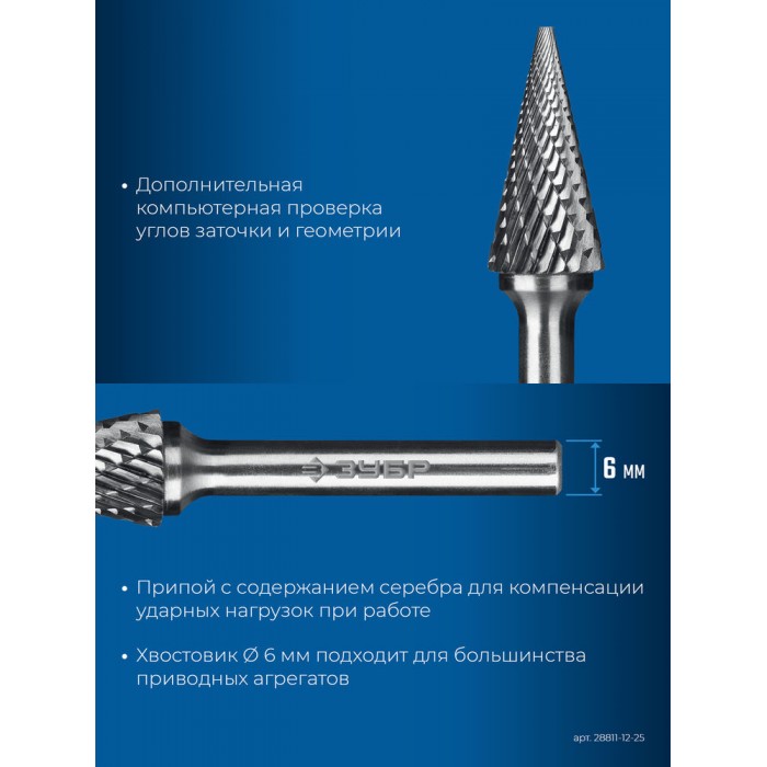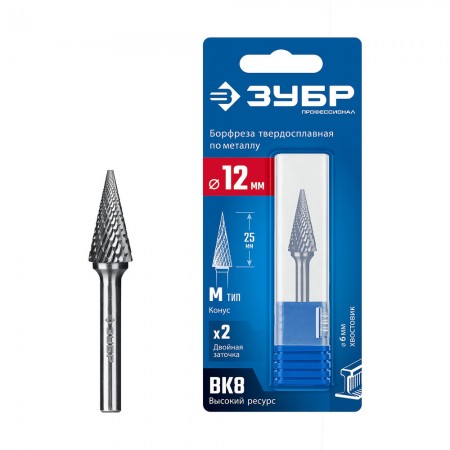Борфреза твердосплавная 12?25 мм тип M конус с острым углом 25° хв-к 6 мм Профессионал ЗУБР 28811-12-25