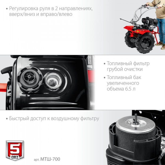 - Рукоять мотоблока с возможностью регулировки по вертикали и горизонтали делает управление более комфортным