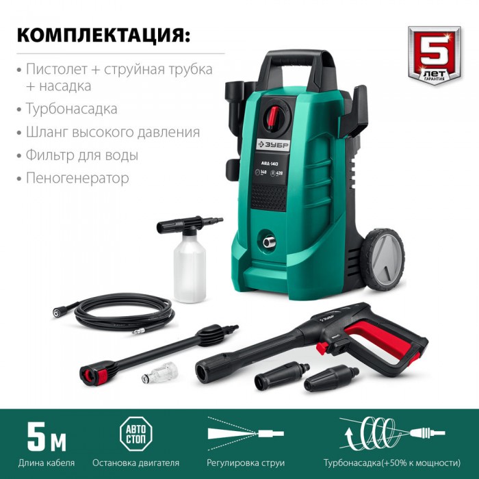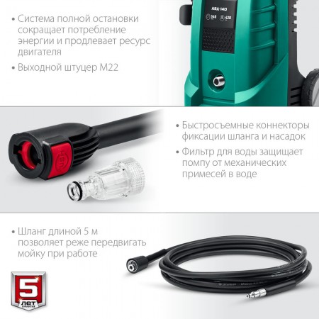 Мощное изделие для удаления любых загрязнений при помощи струи воды высокого давления. Благодаря системе полной остановки, помпа не работает при ненажатом пистолете – это экономит воду и ресурс изделия при неизбежных паузах в работе. Элегантный дизайн и удобная конструкция с держателями для аксессуаров делают работу с изделием комфортной. Регулировка выходной струи позволяет обрабатывать различные поверхности - автомобили, стены, велосипеды, напольные покрытия и т.п.