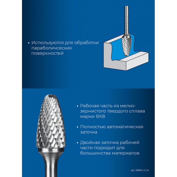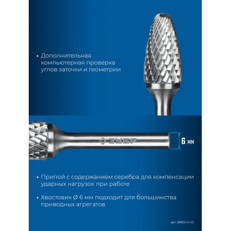 Борфреза твердосплавная 14?25 мм тип F парабола с закругленным углом радиус 3.5 мм хв-к 6 мм Профессионал ЗУБР 28805-14-25