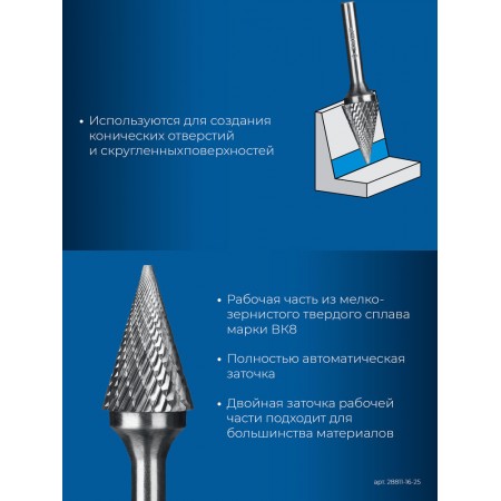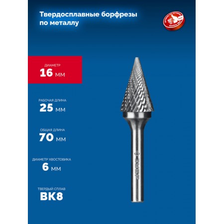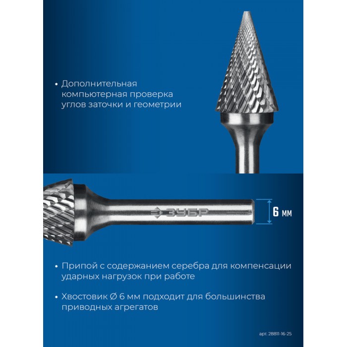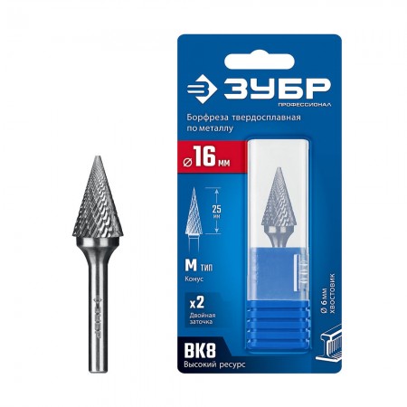 Борфреза твердосплавная 16?25 мм тип M конус с острым углом 30° хв-к 6 мм Профессионал ЗУБР 28811-16-25