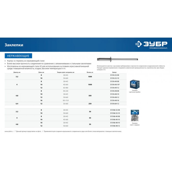 - Корпус и стержень заклепки изготовлены из нержавеющей стали А2 для использования в условиях агрессивной внешней среды: повышенная влажность, осадки, высокие температуры и т.п.