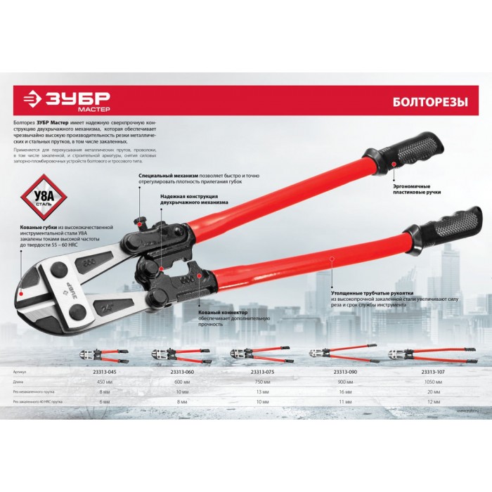 Надежная конструкция двухрычажного механизма и применение высокопрочной закаленной стали в рукоятках болторезов увеличивает силу реза и срок службы ин