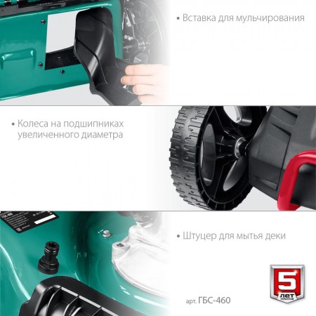 - Задние колеса увеличенного диаметра и подшипники на всех колесах облегчают нагрузку при передвижении газонокосилки. А привод колес от двигателя полнос