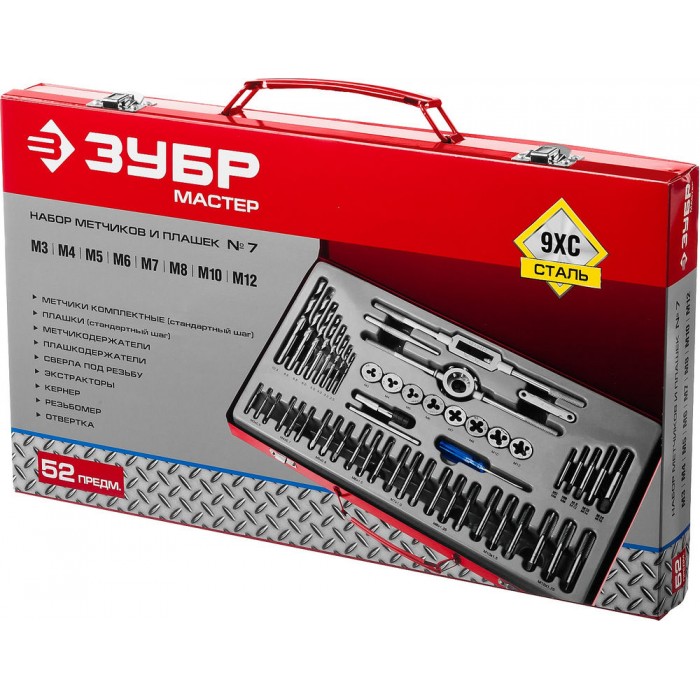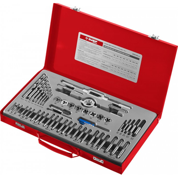 Набор предназначен для резьбонарезных работ в конструкциях и заготовках из сталей и цветных металлов. Метчики ручные однопроходные используются для нарезания внутренней метрической резьбы с нормальным и мелким шагом в глухих и сквозных отверстиях. Метчик трубный предназначен для нарезания внутренней трубной резьбы. Плашки предназначены для нарезания внешней метрической резьбы с нормальным и мелким шагом. Плашка трубная используется для нарезания трубной резьбы Метчикодержатель предназначен для надежного закрепления метчиков Плашкодержатель используется для закрепления плашек при проведении резьбонарезных работ Резьбомер предназначен для подбора необходимого шага метрической резьбы. Кернер используется для предварительного накернивания перед засверливанием. Экстрактор конический с обратной резьбой предназначен для извлечения обломанных болтов и шпилек