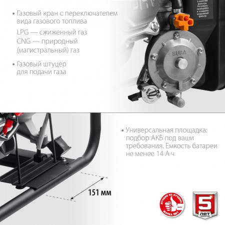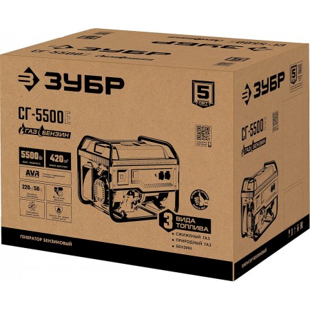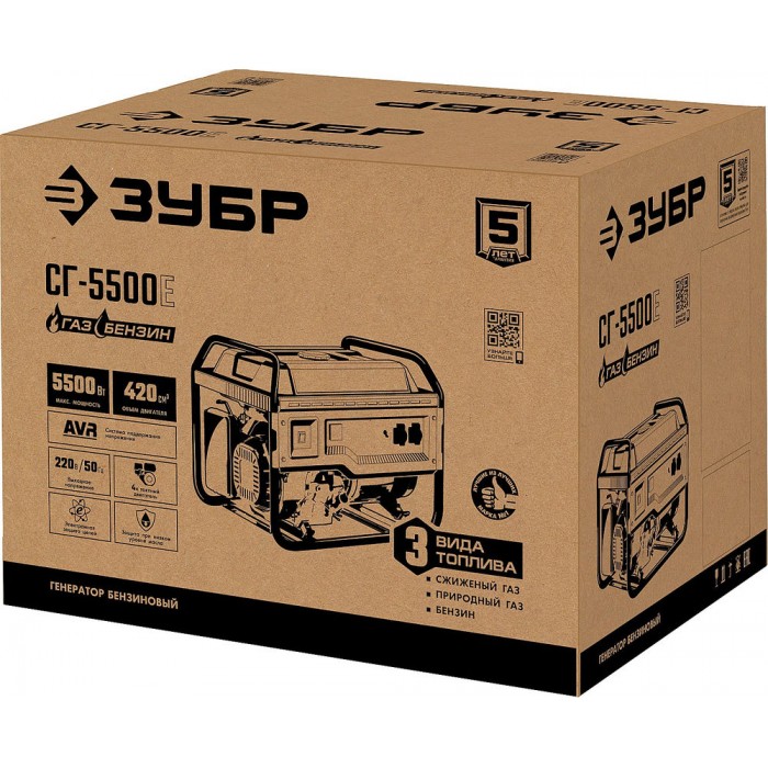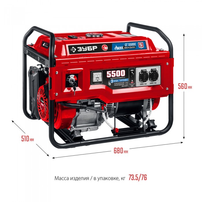 Мощный двухтопливный электрогенератор мощностью 5.5 кВт, работающих как на бензине (АИ-92), так и на газе – при этом, для использования газа не требуется установка дополнительного оборудования. Генератор этой модели используется в загородном доме, строительной площадке и дачном участке для питания бытовой техники, насосных станций и электронагревателей. Аккумуляторная батарея не входит в комплект поставки. Емкость батареи не менее 14 А*ч.