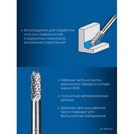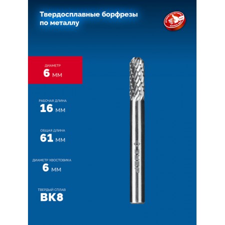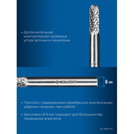 Борфреза твердосплавная 6?16 мм тип C цилиндр со сферическим концом хв-к 6 мм Профессионал ЗУБР 28802-6-16