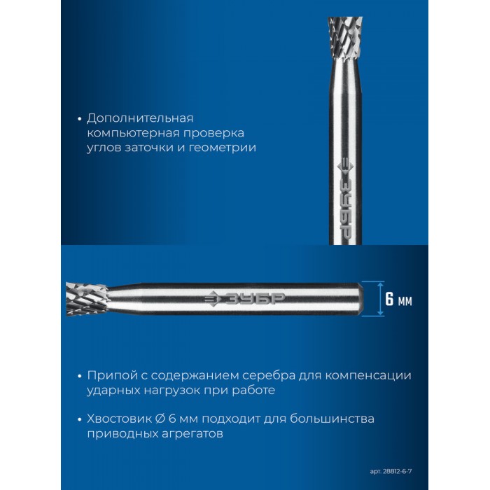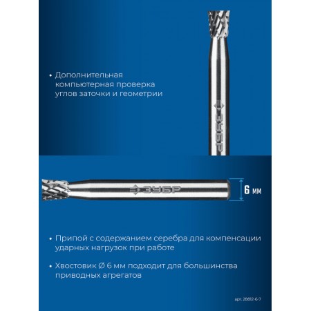 Борфреза твердосплавная 6?7 мм тип N обратный конус угол 10° хв-к 6 мм Профессионал ЗУБР 28812-6-7