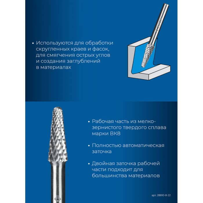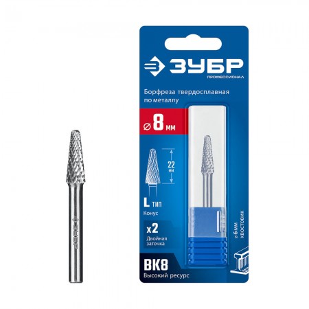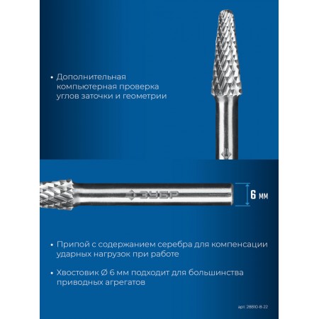Борфреза твердосплавная 8?22 мм тип L конус с закругленным углом 28° радиус 1.4 мм хв-к 6 мм Профессионал ЗУБР 28810-8-22