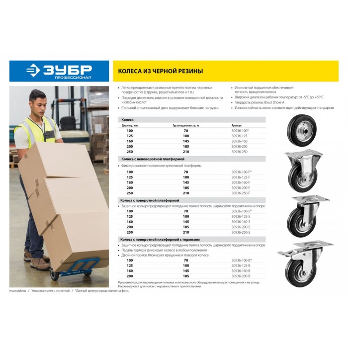 - Применяются на любых типах напольных покрытий. Легко преодолевают различные препятствия на неровных поверхностях. Могут использоваться как внутри помещений, так и на улице. Крепежная платформа свободно вращается благодаря шариковому подшипнику.