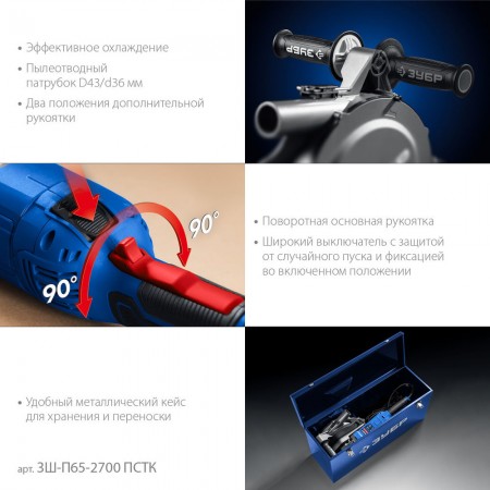 - Эффективное пылеудаление благодаря возможности подключения пылесоса (диаметр патрубка 35мм, совместимо с пылесосами ЗУБР серии ПУ-хх)