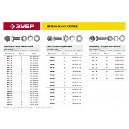 Наборы метрического крепежа изготовлены из высококачественной стали в полном соответствии с действующими стандартами и техническими предписаниями. Находят широкое применение в машиностроении, приборостроении, строительстве, быту и т.д.