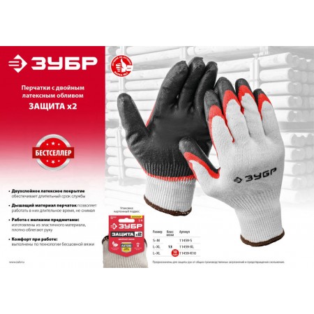 Перчатки х/б х2 ЗАЩИТА с двойным латексным обливом, повышенной износостойкости, 13 класс, размер S-M ЗУБР 11459-S