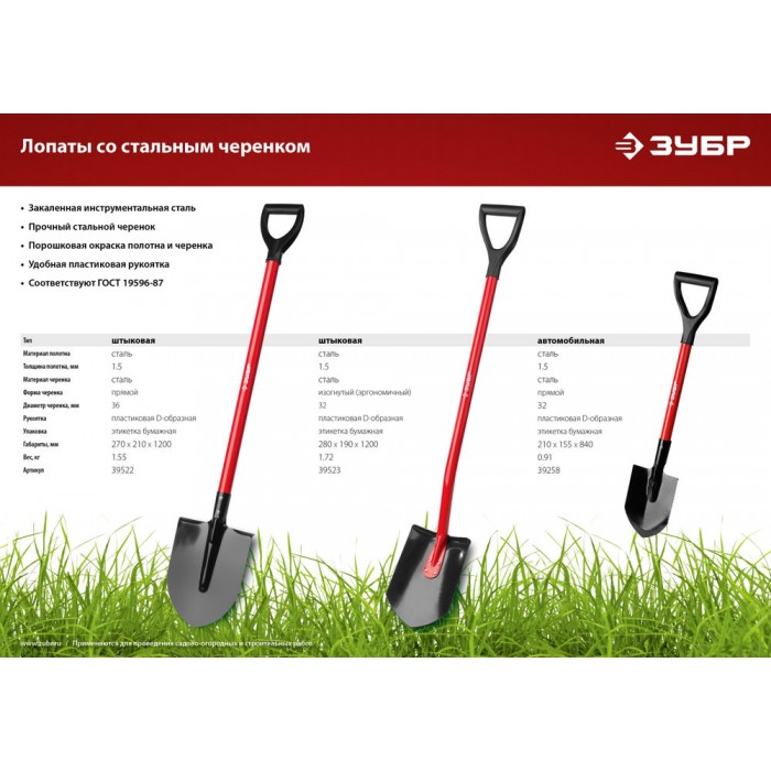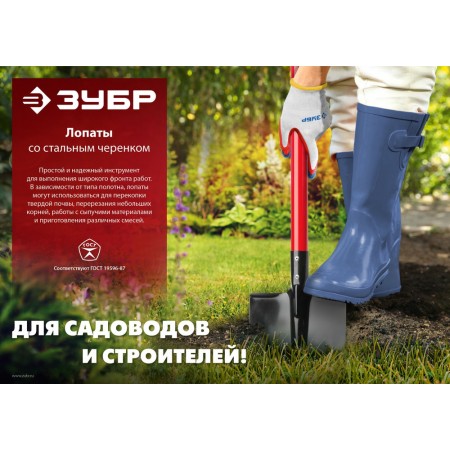 Автомобильная лопата 210 х 155 х 840 мм полотно 1.5 мм закалено стальной черенок с рукояткой ЗУБР МАСТЕР 39258